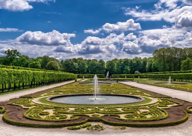 - Alléer och perspektiv: Träd och gångar som leder blicken mot slottets fasad.
